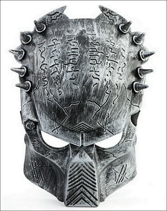 Маска Хищника сама по себе устрашающая - с шипами и характерным взглядом исподлобья. Металлизированная краска и потёртости хорошо эмитируют металл. Крепится маска на чёрную резинку, закрывает только лицо.