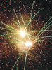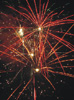 Красные звезды раскрываются красными георгинами в серебряном и зеленом мерцании со вспышками, серебряными кокосами в мерцании тысячи трещащих хризантем; зеленые звезды раскрываются золотыми коронами с красными жемчужинами, золотыми ивами в зеленых мерцающих пионах, золотые кометы раскрываются голубыми георгинами, в финале одновременный залп трещащего золотого мерцания.